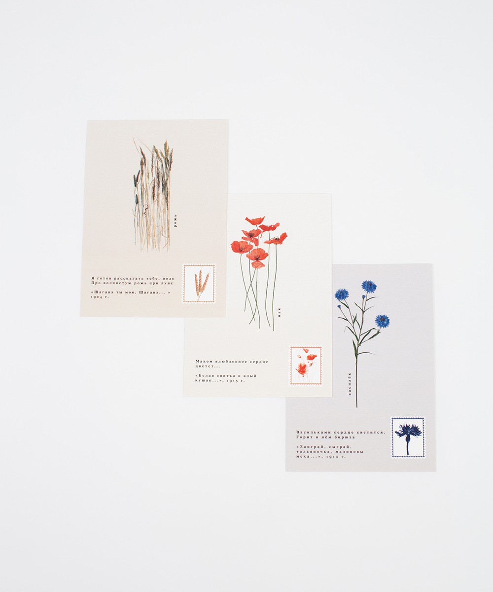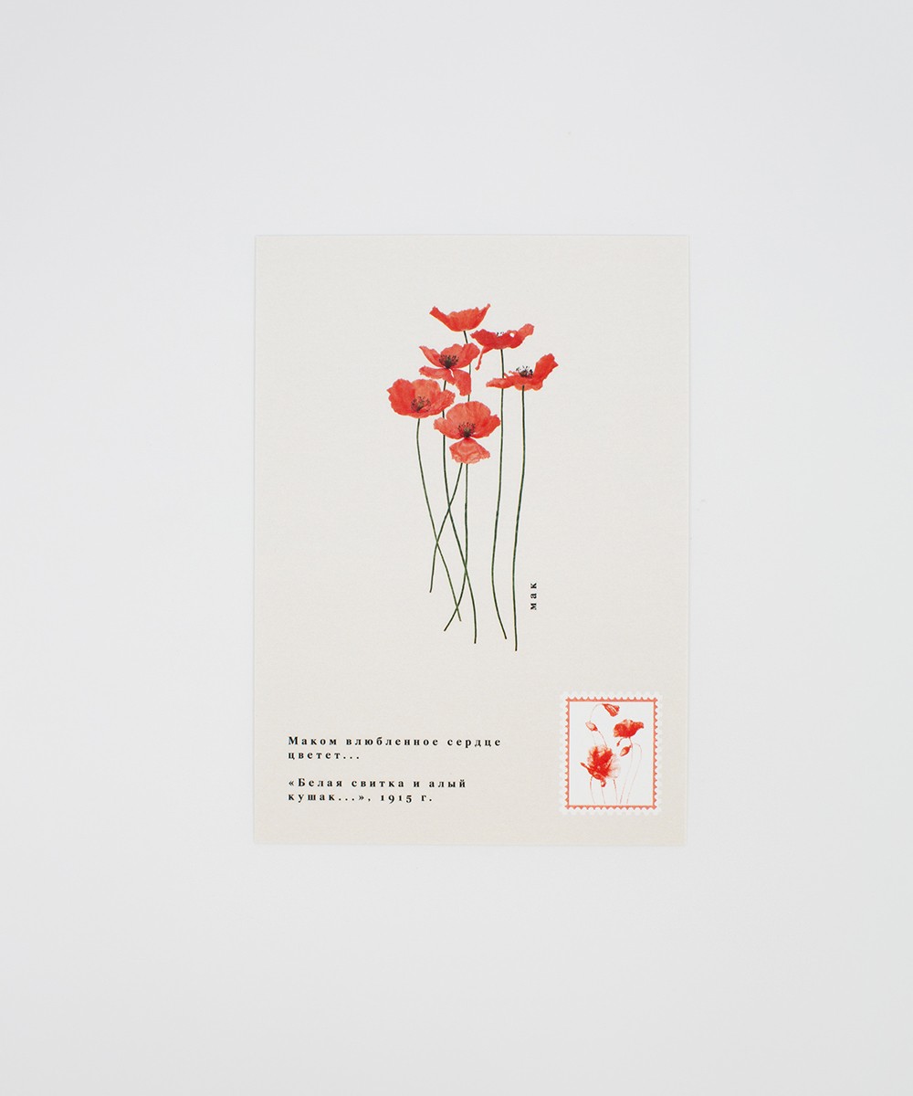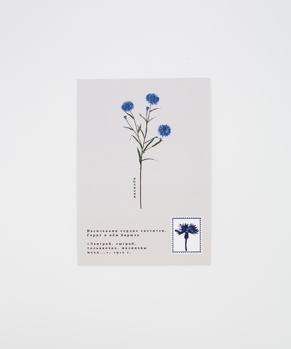 Открытка формата А6, двусторонняя, доступна в принтах «Василёк», «Маки», «Рожь», а также в варианте с негативной печатью.